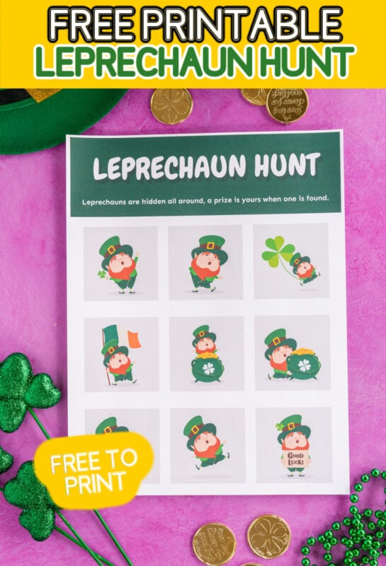 To play this game, you’ll give anyone playing one of the printed out leprechaun hunt sheets. When you say go, players have to race around to find all of the leprechauns on the sheet.