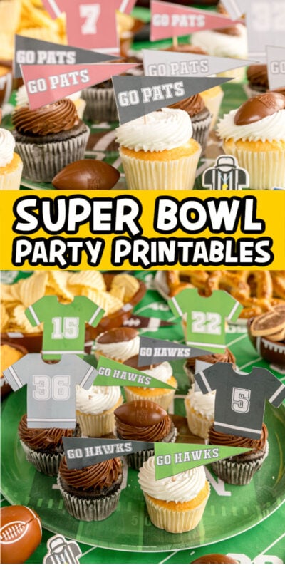 Use these free Super Bowl printables to make hosting a Super Bowl party as easy as running the ball into the end zone with no defense! With Super Bowl party printables for the New England Patriots, Seattle Seahawks, and just generic game day – there’s something for whoever you’re rooting for! Plus, a ton of printable Super Bowl party games you can print for your party too!
