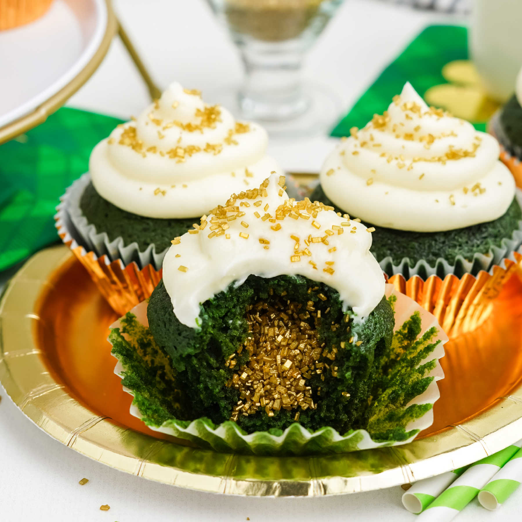 If you want with a completely green twist, you can also add a bit of the gel food coloring to the cream cheese frosting to turn it into a green cream cheese frosting. I like the look of the white with gold sprinkles but green food coloring can be fun twist if you really want that vibrant green cupcakes look!