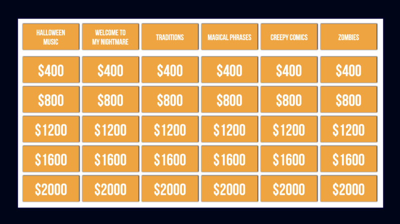 Read the question that corresponds with the value and category they chose (e.g., Halloween Music for $800) and start the process again – whoever buzzes in first and answers correctly wins those points.
