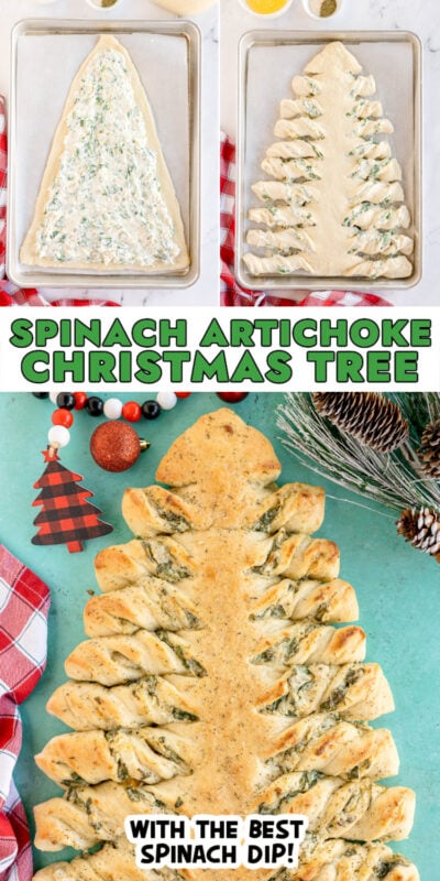 This spinach artichoke Christmas tree is such a fun and festive Christmas appetizer! Homemade pizza dough gets filled with the best spinach artichoke dip then baked into the perfect Christmas party appetizer! It’s easy to make, unique, and delicious!